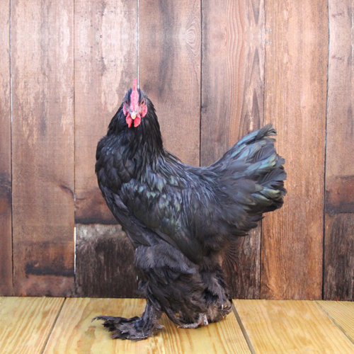 Black Cochins originally came from crosses of Buff and White Cochins. Black Cochin chick are black with white wing tips, chest and feet. They have single combs and feathers on their yellow legs and toes. Adults have greenish plumage with the undercover being slate. Cochins have a notably large body, with soft and loose feathers that accentuate their size.