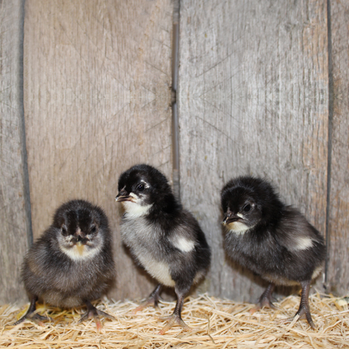 Old English bantams were developed in England many years ago presumably from the common crossbred bantams of the countryside. Black English bantam chicks are primarily black with some white on the wing tips, front of neck and abdomen. They have single combs and clean, black legs and feet. All the adult plumage is greenish black while the under color is dull black.