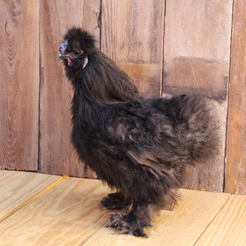 Silkies were described by Marco Polo in the 13th century as “hens which have hair like cats, are black, and lay the best eggs.” Black Silkie bantam chicks are black with white wing tips and some white on the neck. Their skin, beak, legs and toes are black. Some have beards and muffs while others do not. They have walnut combs, a small crest, five toes on each foot and feathers on their legs and feet. Adults have black plumage and noticeable blue ear lobes. They are noticeable for their hair like feathers created by their lack of tiny hamuli and scrolls that allow the barbules of the feather to connect.
