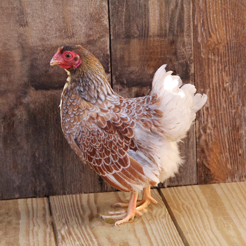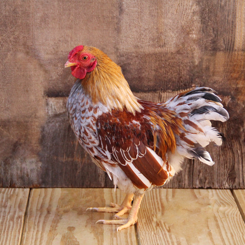 Wyandotte bantams were first bred in England. Blue Laced Red Wyandotte bantam chicks are three colors: black laced red, blue laced red, and white laced red. They have rose combs and clean, yellow legs and feet. Adult male’s heads are red tipped with blue while the hackle and saddle plumage is red laced with blue. The wing primaries are red, and the remaining plumage is primarily red laced with blue. The female plumage is primarily red laced with blue.