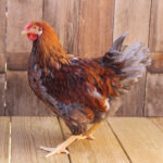 The true origin of the Wyandotte is unknown, however, Dark Brahmas and Spangled Hamburgs were probably used in the development of the original Silver Laced variety. Wyandotte chicks are primarily brown, with some light blue to black on their backs and heads. They have a rose comb with yellow and brown, clean legs and feet. Adults have a primarily red plumage with blue lacing around the edges of each feather.