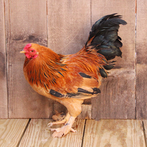 Standard Brahmas were developed from a Malay and Cochin cross. Later, Brahma bantams were developed in England. Buff Brahma bantam chicks have black backs, gold heads and light-yellow wing tips, chests and abdomens. They have pea combs and feathered, yellow legs and feet. Adults have a golden buff head and the web of the hackle feathers is greenish black laced with golden buff. The breast body, back, front of the neck, wing shoulders, fronts, bows and coverts are golden buff. The wing primaries are black with a golden buff border. The males saddle feathers are golden buff with a V-shaped black stripe and the tail is black with the coverts being greenish black laced with golden buff. The shank feathers are golden buff and black with the black feathers being laced with golden buff.