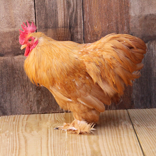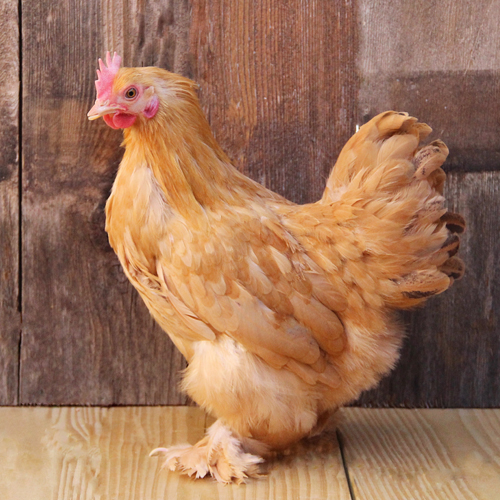 Cochin bantams first appeared in England around 1860. It was first considered that they had been bred down from large Cochins, but that is not the case as the foundation birds were brought from China by returning soldiers. Buff Cochin bantam chicks are solid buff or straw colored with the heads and back being darker. The chest and abdomen is a lighter buff. They have single combs and feather, yellow legs and feet. Adult plumage is an even shade of rich golden buff throughout the entire surface.
