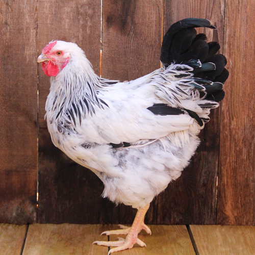 They have rose combs and clean, yellow legs and feet. Adult males and females have a similar plumage that is primarily white with black markings. The wing primaries are black or black edges while the secondaries have a black inner web and white outer web. The tail is green black except the top two feathers that may be laced with white, and the coverts may or may not be laced with white.