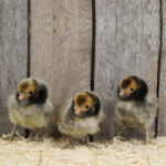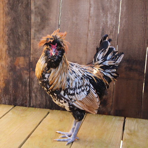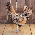 Brabanters are a Dutch breed of crested chicken that originated in the region of Brabant between Belgium and the Netherlands. The breed is very old, with an image of a Brabanter appearing in a 17th century painting. Cream Brabanter chicks are light brown to dark brown with crest, muffs and beard. The clean legs are gray, and if present, the comb is V-shaped. Brabanter adults have a flat sided upright crest that isn’t as large or globular as Polish crests. The plumage is cream, with each feather ending with a half-moon black spangle. The tail may be entirely black. C