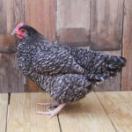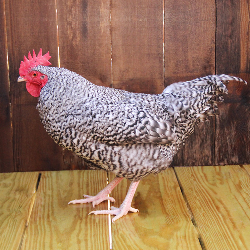 Cuckoo Maran were developed in France as a dual-purpose breed in the early 1900’s from de Malines, French Cuckoo or Rennes, Langshans, Faverolles and Barred Plymouth Rocks. Cuckoo Maran chicks are primarily black with a white spot on the top of the head. The front of the neck, wing tips and abdomen are white. They have single combs and clean, black and white feet and legs. All the plumage of adult Cuckoo Maran is cuckoo pattern with each feather marked across with black and white bands. Because of the action of the barred gene, the male plumage is slightly lighter than the female. Female Marans lay extremely dark brown or rich chocolate colored eggs.