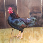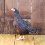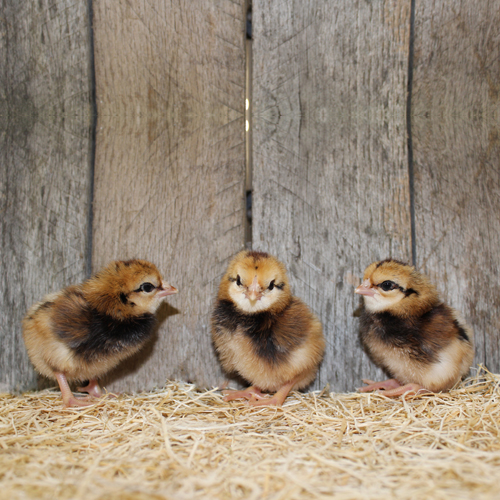 Cornish bantams were developed by crossing standard Cornish with Black Red Game bantams. Cornish chicks have dark brown heads and backs with two light brown chipmunk streaks running down the back. The face, chest, abdomen and wing tips are light brown to white. Adult males are primarily greenish black with some dark red. The main tail and wing primaries are black, with the wing primaries having some red edging. Adult females have a greenish black head and a black main tail. The remaining plumage is primarily reddish mahogany with greenish black lacing.