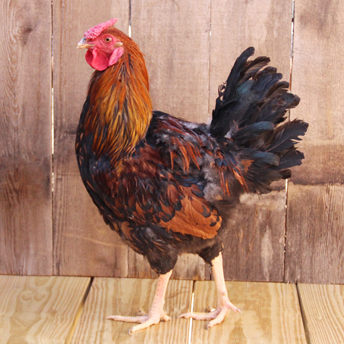 They have a rose comb with yellow and brown, clean legs and feet. Adult males have a gold head with each feather having a black stripe. The neck is greenish black with narrow gold lacing, the back is golden, and the tail is black. The breast feathers are gold with greenish black lacing. Adult females have the same gold feathers with greenish black lacing on their body, back, breast and lower thighs. The female head is gold and the tail is black.