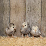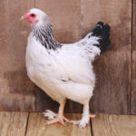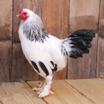 Standard Brahmas were developed form a Malay and Cochin cross. Later, Brahma bantams were developed in England. Light Brahma bantam chicks have gray backs with light yellow heads, wing tips and abdomens. They have pea combs and feathered, yellow legs and feet. Adults have a white head and the web of the hackle feathers is greenish black laced with white. The breast body, back, front of the neck, wing shoulders, fronts, bows and coverts are white. The wing primaries are black with a white border. The male’s saddle feathers are white with a V-shaped black stripe and the tail is black with the coverts being greenish black laced with golden white. The shank feathers are golden buff and black with the black feathers being laced with white.
