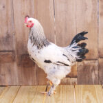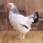 Adult Light Brahmas have a columbian plumage pattern and fully feathered shanks and toes. The head is silvery white, and the hackle feathers are greenish black laced with silvery white. The front of the neck, breast, body and back is white. The main tail is black, and coverts are laced with silvery white. They are considered a dual-purpose bird that lays brown eggs, but they are mainly kept for their unique appearance.