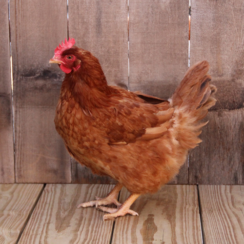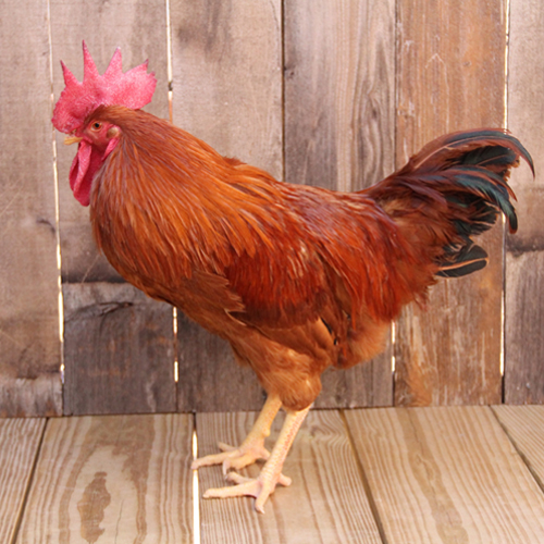 New Hampshire Reds were developed in the early 1900’s with Rhode Island Reds as the foundation stock. They were selected for early growth and maturity, meat production and production of large brown eggs. New Hampshire Red chick are light red with lighter chests and wing tips. They have single combs and clean, yellow legs and feet. Adult plumage is primarily chestnut red with a black tail. Males will appear to be slightly darker because the male sickle, hackle, back, covert and wing bow plumage is a deeper chestnut color.