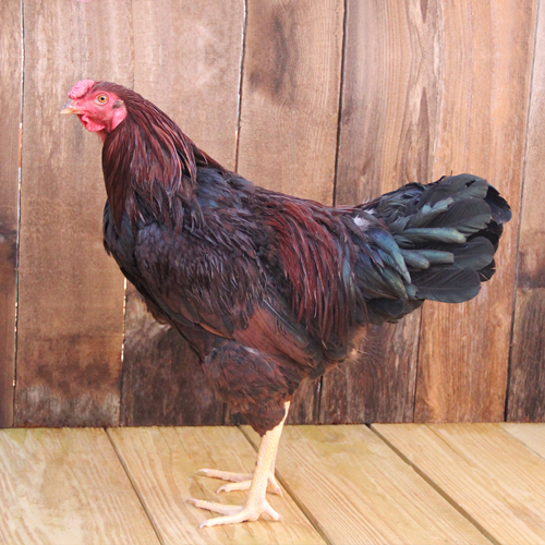 Adult males have greenish black plumage with red lacing on the back, saddle and hackle feathers. Their breast, sickle and tail feathers are also greenish black, while their head, upper back and wing bows are primarily red. Adult females have hackle and wing feathers that are black, while most of the remaining plumage is reddish bay with some black penciling.