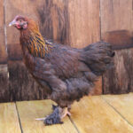 Partridge Cochin chicks are dark brown with white chests and wing tips and light brown legs and toes. They have single combs and feathered yellow legs and feet. Adult females have a deep red head and black hackles with a slight red pencil. The front of neck, breast, back, body, wing bows, wing coverts, lower thighs, shanks and toes are deep reddish bay with black penciling. Adult males have a red head and hack with back feathers that are greenish black with red lacing. The upper back is red while the sickles, coverts, main tail, shanks and body feathers are black. Cochins have a notably large body, with soft and loose feathers that accentuate their size.