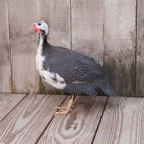 Pied Guineas are a relatively rare variety that are the same color as the Pearl variety except they have white throats, chests and wings. Guineas, which are known as g, are very active and easy to raise. After about 4 weeks of age, they require very little attention and will take care of themselves by hustling for their food. Some of the benefits of having a farm flock of guineas are as follows: very fine “watch dogs”, keep snakes away from the farm and consume grasshoppers, ticks (including those which carry Lyme Disease) and other insects.