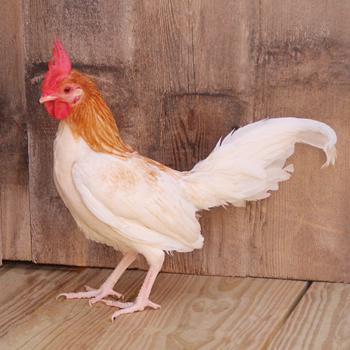 Old English bantams were developed in England many years ago presumably from the common crossbred bantams of the countryside. Red Pyle Old English bantam chicks are cream to light yellow with a gold face and two light gold streaks down the back. They have single combs and clean, white legs and feet. The breast and front of the neck of adult females is salmon, while most of the remainder of the body is white. Adult males have orange head, hackle and saddle plumage while the back is red. Most of the remaining plumage is white.