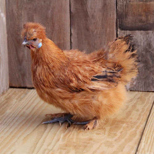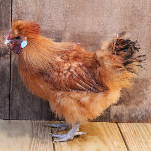 Silkies were described by Marco Polo in the 13th century as “hens which have hair like cats, are black, and lay the best eggs.” Red Silkie bantam chicks are red with black or brown streaks down the back. Their skin, beak, legs and toes are black. Some have beards and muffs while others do not. They have walnut combs, a small crest, five toes on each foot and feathers on their legs and feet. The adult plumage is dark red. They are noticeable for their hair like feathers created by their lack of tiny hamuli and scrolls that allow the barbules of the feather to connect.