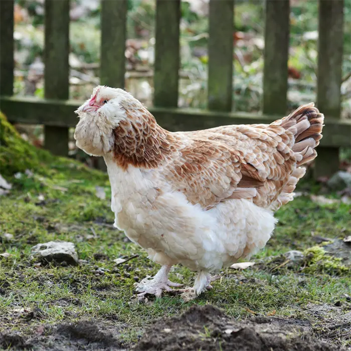 With soft salmon-colored feathers and fluffy beards, Salmon Faverolles are as charming as they are practical. They’re excellent cold-hardy layers of tinted eggs, dual-purpose birds, and incredibly gentle, making them a joy for families and mixed flocks.