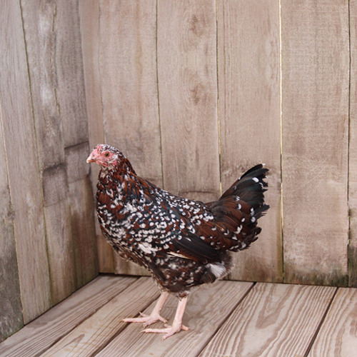 The Sussex breed originated in Sussex County, England to be used for table poultry. Speckled Sussex chicks are dark brown with two light brown streaks down the back. They have white wing tips, chests and abdomens. They have single combs and clean, white legs and feet. Adult females have mahogany bay plumage on their head, neck, back, breast, body, lower thigh and tail coverts and each feather is tipped with a small white spangle. The main tail is black mottled with brown and tipped with a white spangle and the wing primaries are black and white. Adult males have similar plumage to the female except that the plumage of the head, neck and back is more lustrous, and the sickles and coverts of the tail are greenish black tipped with white.