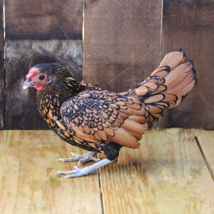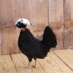 W.C.B Polish Bantams feature glossy black plumage highlighted by a large, fluffy white crest. Their compact bantam size, active and curious nature, and gentle temperament make them excellent exhibition birds as well as charming additions to backyard flocks.