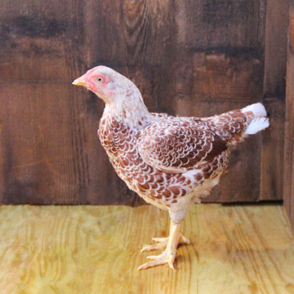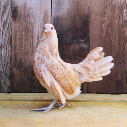 Japanese bantams, first known as “Chabo”, originated in South China, which is now Vietnam, Thailand and Malaysia. The first color was red-brown with white and black birds appearing as sports from them. The breed is recognizable for their short body and legs that contrasts their large, upright tail. Japanese bantam chicks are solid cream or light yellow, occasionally one might have a black spot on top of the head. They have single combs and clean, yellow feet and legs. Adult White Japanese plumage including the quill, is entirely white.